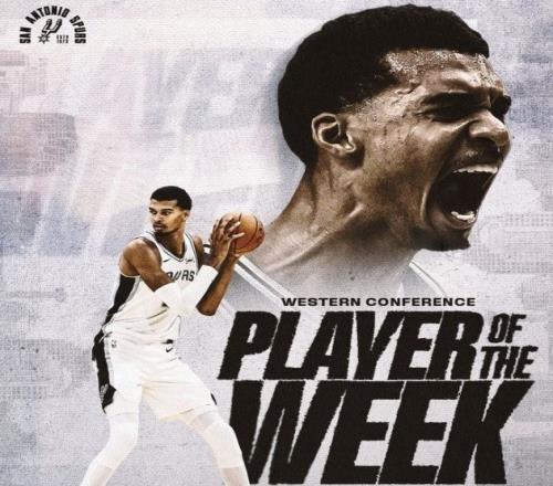 开赛季第一周,文班亚马成功拿下西部周最佳球员,这也是他职业生涯第二次获奖。