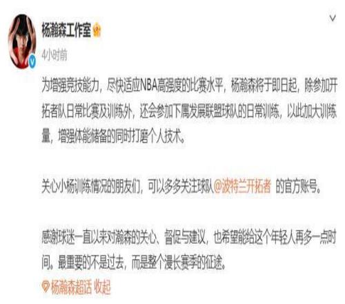 随后,杨瀚森工作室更新社媒发声:“为增强竞技能力,尽快适应NBA高强度的比赛水平,杨瀚森将于即日起,除参加开拓者队日常比赛及训练外,还会参加下属发展联盟球队的日常训练,以此加大训练量,增强体能储备的同时打磨个人技术。”