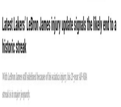 如果詹姆斯的连续入选纪录就此终结(目前来看可能性极大),这将再次提醒人们,这位NBA历史得分王的职业生涯已临近尾声。詹姆斯将于12月年满41岁,在职业生涯的这个阶段,他最关心的是冲击个人第五座总冠军奖杯。