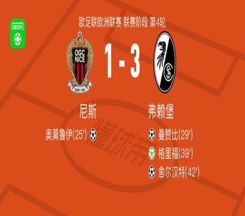 北京时间11月7日欧足联欧洲联赛 联赛阶段 第4轮,尼斯对阵弗赖堡。尼斯奥莫鲁伊破门。弗赖堡曼赞比破门,舍尔汉特破门,格里福破门。最终比分尼斯 1-3 弗赖堡。