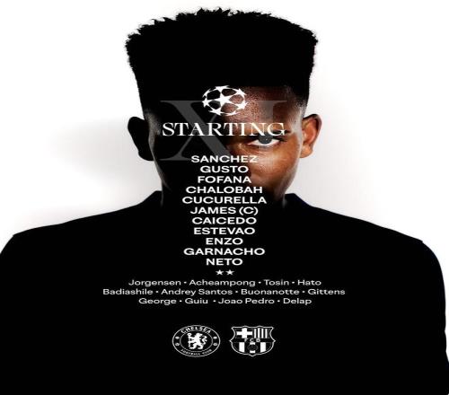 北京时间11月26日04:00,欧冠 联赛阶段 第5轮,切尔西主场迎战巴塞罗那,赛前双方球队首发名单公布如下: