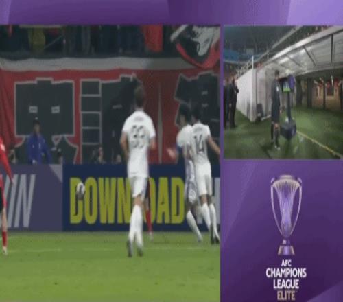 比赛的第50分钟,周定洋禁区内带球突破,被荒木隼人撞倒,主裁判第一时间判罚点球。随后,视频助理裁判介入判罚,并且要求主裁判回看慢镜头。