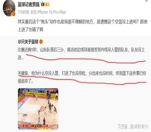 其实,在王浩然命中三分球以后,他们也还留给山东队1秒的时间。在见证奇迹的篮球赛场上,最后1秒命中绝杀球或扳平球,其实也是屡见不鲜。不过,此时山东队却突然断电。男篮国手高诗岩在发界外球时,竟然神出鬼没的坑了队友一把。当时深圳队死守山东队外线,山东队在外线机会并不多,此时张旭灵机一动直接空切篮下,高诗岩也心领神会的开球,后者得球后直接上篮,可惜两分上篮没有打进。