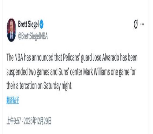 北京时间12月29日,NBA官方公布了昨日冲突的罚单,鹈鹕后卫阿尔瓦拉多禁赛两场,太阳中锋马克-威廉姆斯禁赛一场。两人禁赛场次将没有薪水收入。阿尔瓦拉多将在12月30日对尼克斯和1月1日对公牛的比赛中禁赛。马威将在12月30日对奇才的比赛中禁赛。