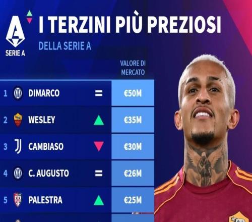 北京时间12月25日,在更新了意甲球员的身价后,德转列出了目前意甲边后卫身价排名前10的球员,迪马尔科5000万欧元高居第一,韦斯利-利马3500万欧元第二,安德烈亚-坎比亚索3000万欧元