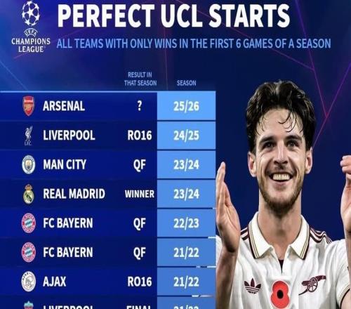 北京时间12月11日,在欧冠联赛阶段第6轮的比赛, 阿森纳客场3-0击败了布鲁日,目前以6战全胜的成绩领跑欧冠积分榜。对此德转列出自欧冠1992年改制以来,所有单赛季前6战全胜球队最